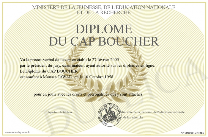 Envoyez par email votre Diplôme du CAP BOUCHER personalisé