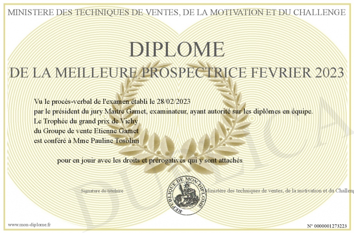 Envoyez par email votre Diplôme de la meilleure Prospectrice Février 2023 personalisé