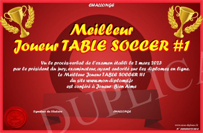 Envoyez par email votre Meilleur Joueur TABLE SOCCER #1 personalisé
