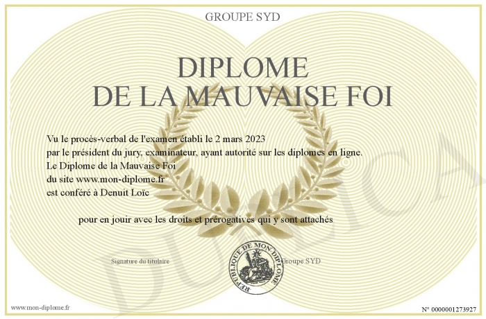 Envoyez par email votre Diplôme de la Mauvaise Foi personalisé