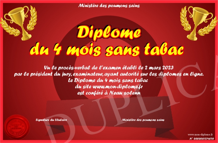 Envoyez par email votre Diplôme du 4 mois sans tabac personalisé
