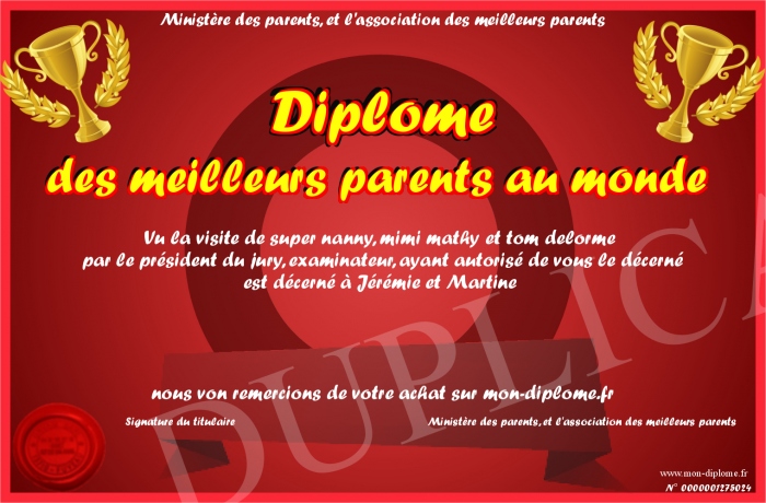 Envoyez par email votre Diplôme des meilleurs parents au monde personalisé