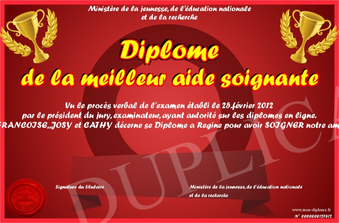 Envoyez par email votre Diplôme de la meilleur aide soignante personalisé