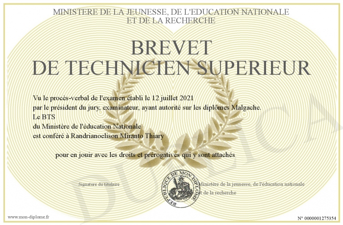 Envoyez par email votre Brevet de Technicien Superieur personalisé