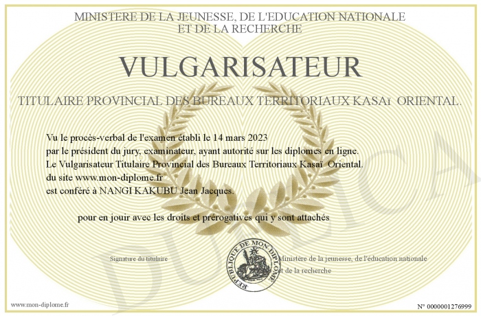 Envoyez par email votre Vulgarisateur Titulaire Provincial des Bureaux Territoriaux Kasaï Oriental. personalisé