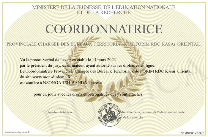 Envoyez par email votre Coordonnatrice Provinciale Chargée des Bureaux Territoriaux de FORIM RDC Kasaï Oriental. personalisé