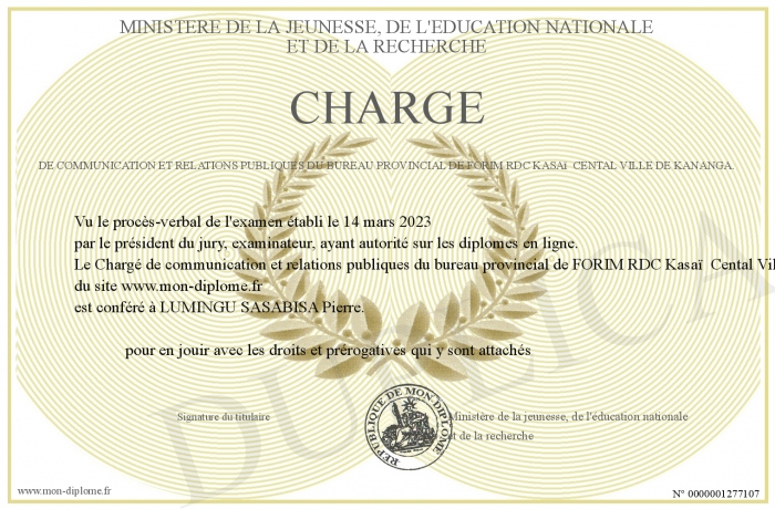 Envoyez par email votre Chargé de communication et relations publiques du bureau provincial de FORIM RDC Kasaï  Cental Ville de Kananga. personalisé
