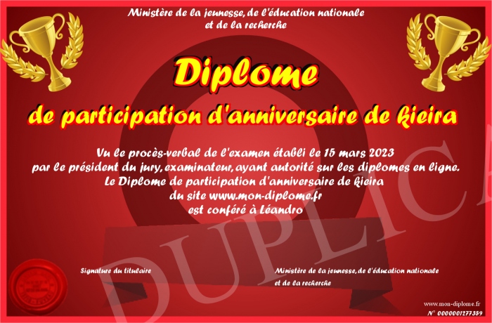 Envoyez par email votre Diplôme de participation d'anniversaire de kieira personalisé