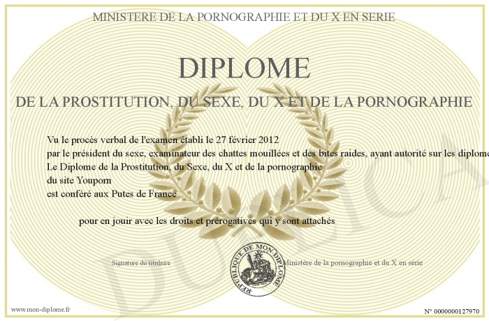 Envoyez par email votre Diplôme de la Prostitution, du Sexe, du X et de la pornographie personalisé