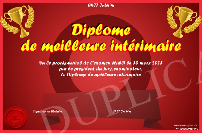 Envoyez par email votre Diplome de meilleure intérimaire personalisé
