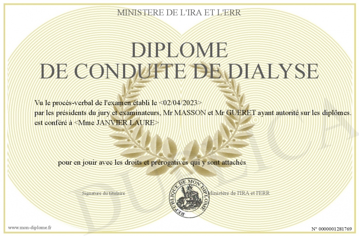 Envoyez par email votre Diplôme de conduite de Dialyse personalisé
