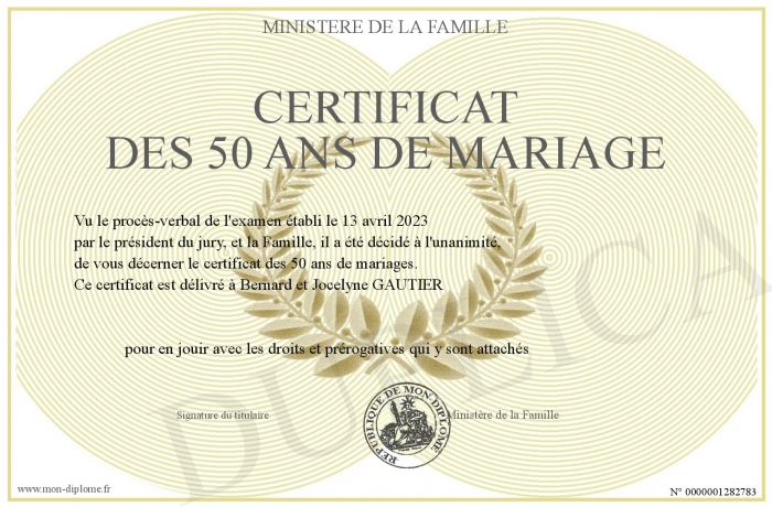 Envoyez par email votre CERTIFICAT DES 50 ANS DE MARIAGE personalisé