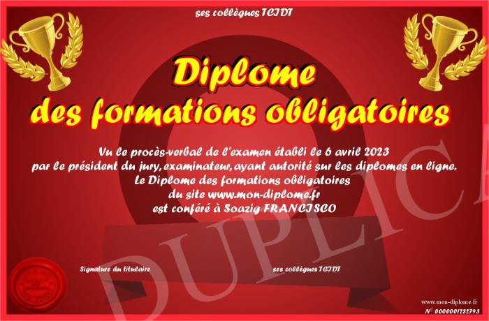 Envoyez par email votre Diplôme des formations obligatoires personalisé
