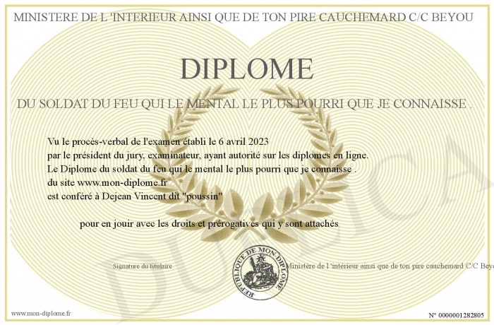Envoyez par email votre Diplôme du soldat du feu qui le mental le plus pourri que je connaisse . personalisé