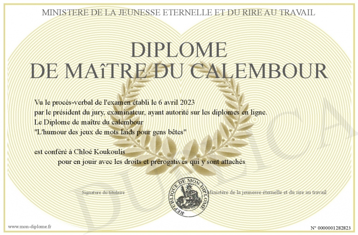 Envoyez par email votre Diplôme de maître du calembour personalisé