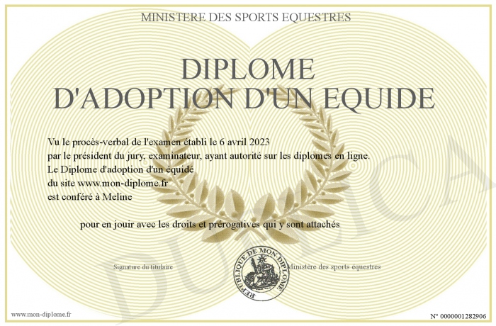 Envoyez par email votre Diplôme d'adoption d'un équidé personalisé
