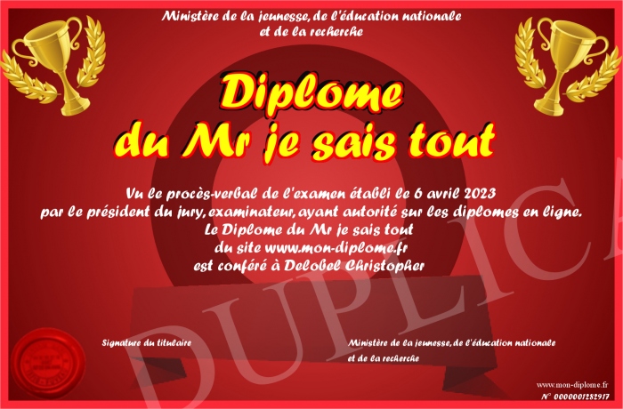 Envoyez par email votre Diplôme du Mr je sais tout personalisé