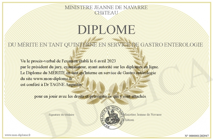 Envoyez par email votre Diplôme du MÉRITE en tant qu'Interne en service de Gastro entérologie personalisé