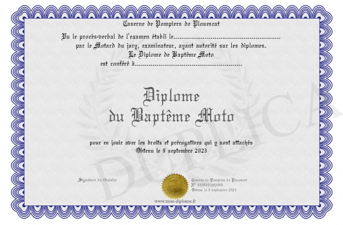 Envoyez par email votre Diplôme du Baptême Moto personalisé