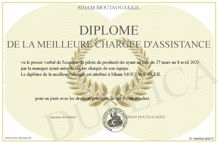 Envoyez par email votre DIPLOME DE LA Meilleure chargée d'assistance personalisé