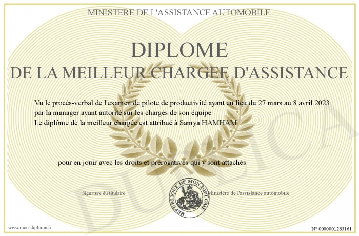 Envoyez par email votre Diplôme de la meilleur chargée d'assistance personalisé