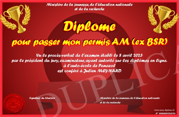 Envoyez par email votre Diplôme pour passer mon permis AM (ex BSR) personalisé