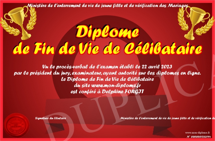 Envoyez par email votre Diplôme de Fin de Vie de Célibataire personalisé