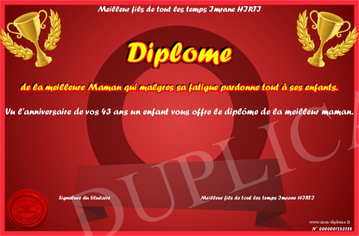 Envoyez par email votre Diplome de la meilleure Maman qui malgres sa fatigue pardonne tout à ses enfants. personalisé
