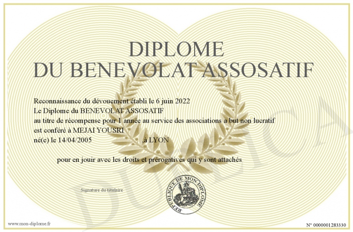 Envoyez par email votre Diplôme du BENEVOLAT ASSOSATIF personalisé