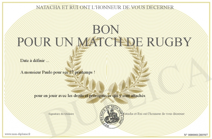 Envoyez par email votre Bon pour un match de rugby personalisé