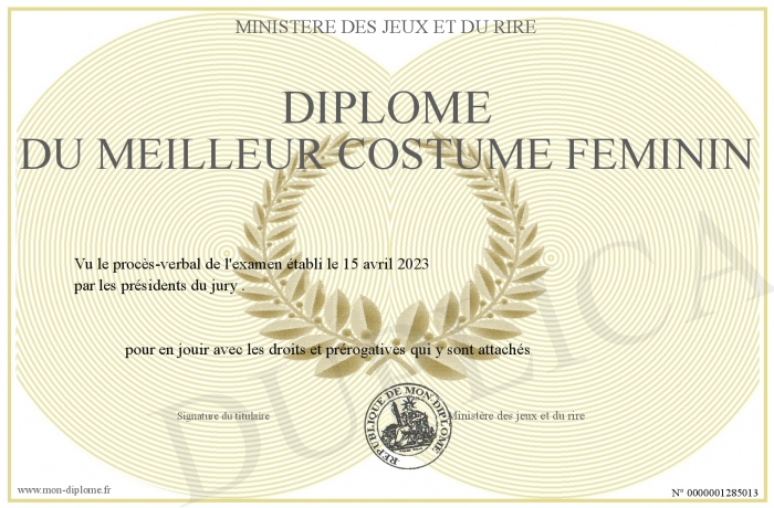 Envoyez par email votre Diplôme du meilleur costume féminin personalisé