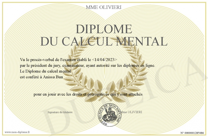 Envoyez par email votre Diplôme du calcul mental personalisé