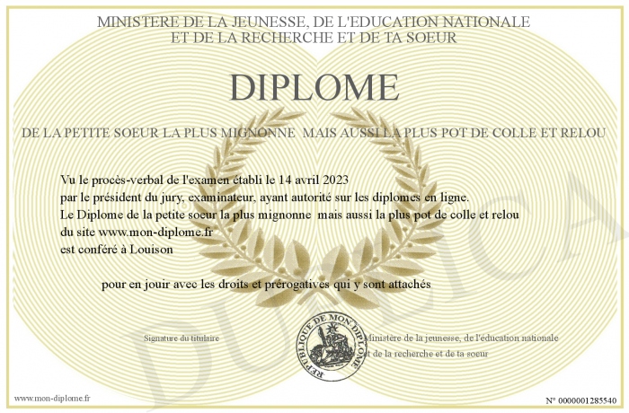 Envoyez par email votre Diplôme de la petite soeur la plus mignonne mais aussi la plus pot de colle et relou personalisé