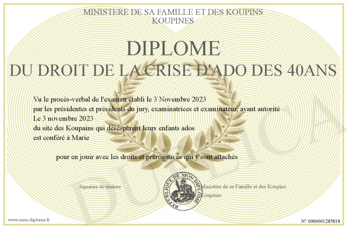 Envoyez par email votre Diplôme du droit de la crise d'ado des 40ans personalisé