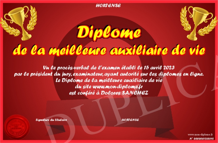 Envoyez par email votre Diplôme de la meilleure auxiliaire de vie personalisé