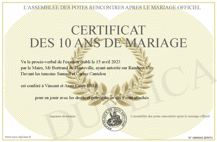 Envoyez par email votre Certificat des 10 ans de mariage personalisé