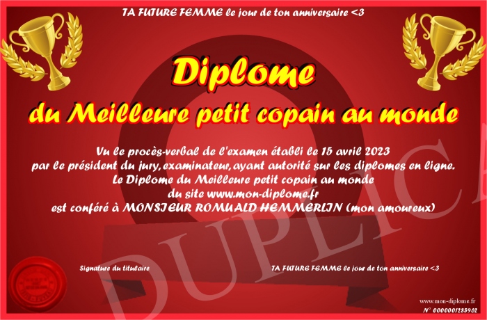 Envoyez par email votre Diplôme du Meilleure petit copain au monde personalisé