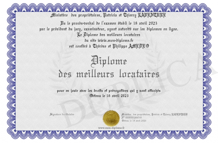 Envoyez par email votre Diplôme des meilleurs locataires personalisé