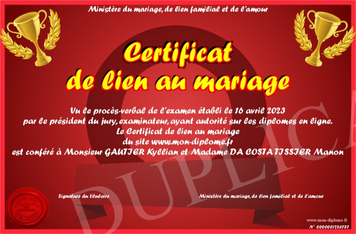 Envoyez par email votre Certificat de lien au mariage personalisé