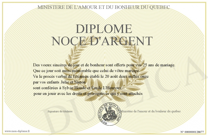 Envoyez par email votre Diplôme noce d'argent personalisé