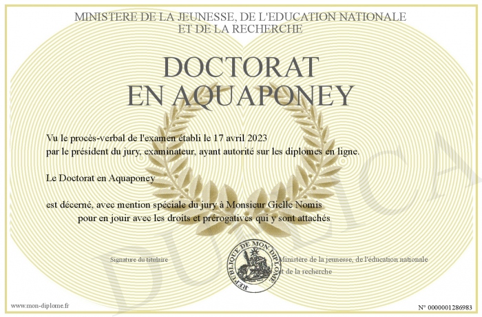Envoyez par email votre Doctorat en Aquaponey personalisé