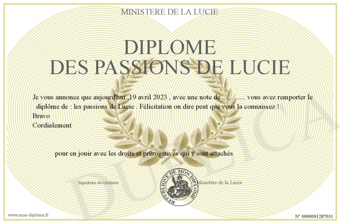 Envoyez par email votre diplome des passions de Lucie personalisé