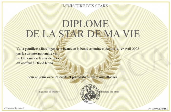 Envoyez par email votre Diplôme de la star de ma vie personalisé