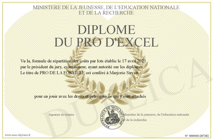 Envoyez par email votre Diplôme du PRO D'EXCEL personalisé