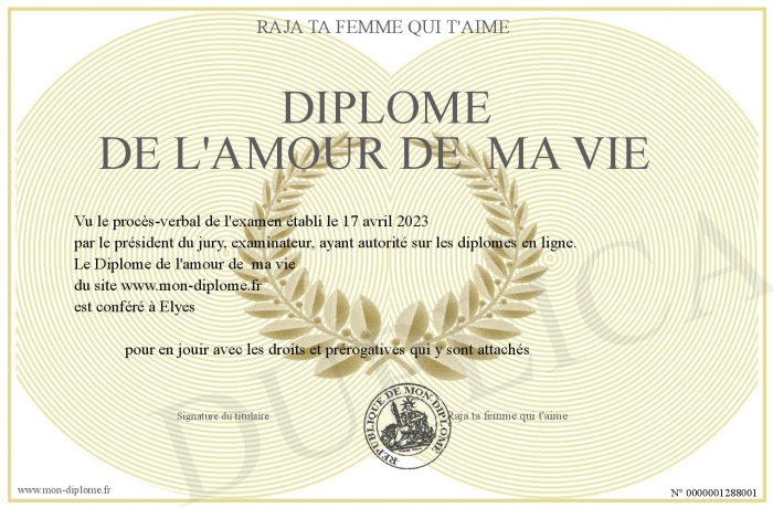 Envoyez par email votre Diplôme de l'amour de ma vie personalisé