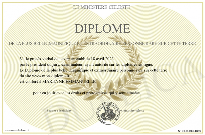 Envoyez par email votre Diplôme de la plus belle ,magnifique et extraordinaire personne rare sur cette terre personalisé