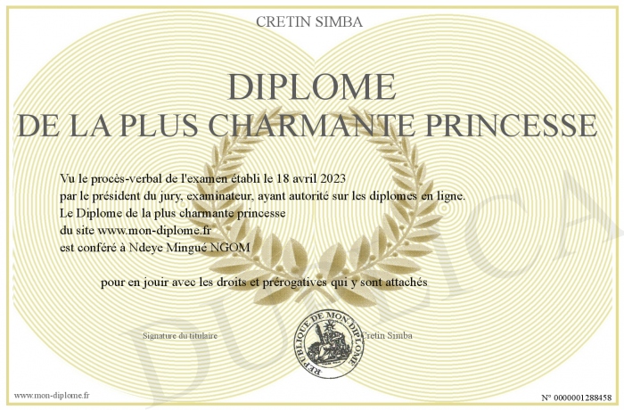 Envoyez par email votre Diplôme de la plus charmante princesse personalisé