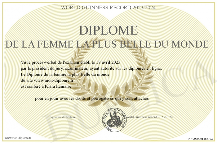 Envoyez par email votre Diplôme de la femme la plus Belle du monde personalisé