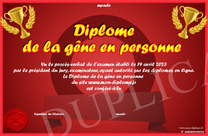 Envoyez par email votre Diplôme de la gêne en personne personalisé