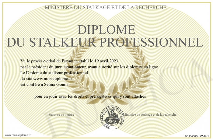Envoyez par email votre Diplôme du stalkeur professionnel personalisé